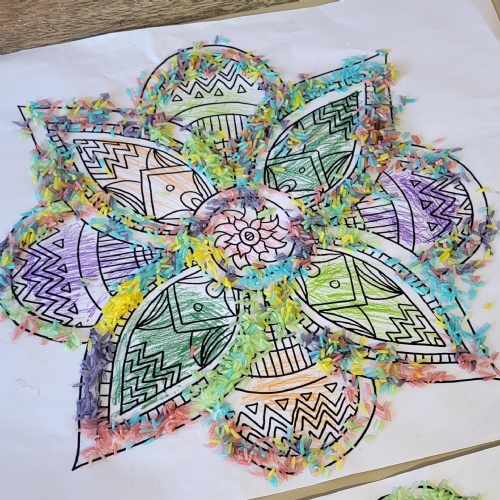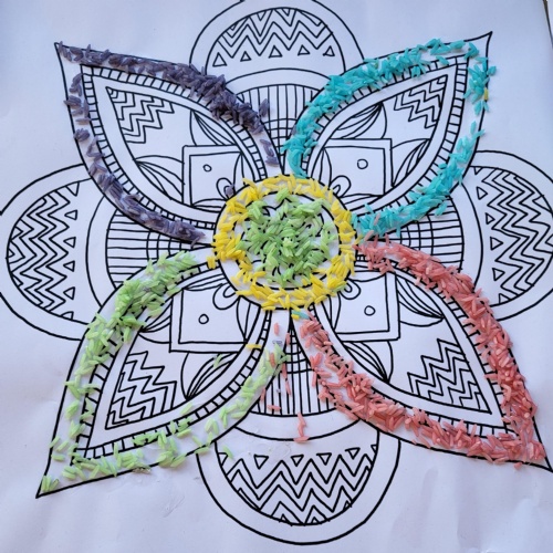 Early in the morning, on the second day, people wake up and create kolam at the entrance of their homes. These are patterns made from brightly colour rice. We had a go at doing our own art work similar to this.